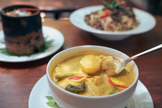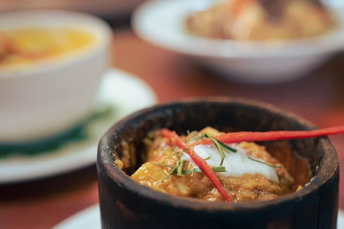 Probarás fideos con curry jemer, guisos, salteados, costillas al horno cerca del Museo de Tuol Sleng, tortitas de pescado de Battambang, curry Fish Amok y más.