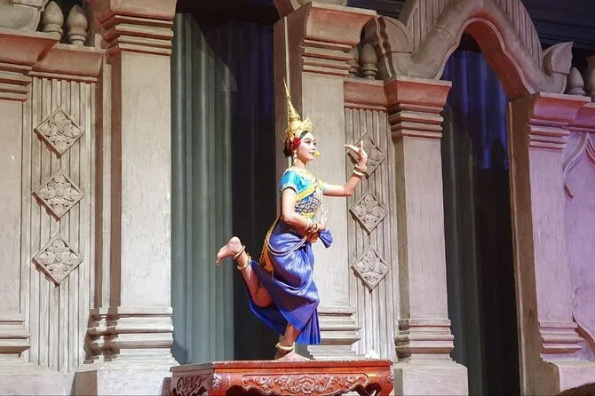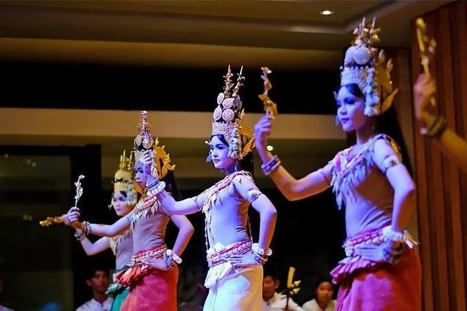 Disfruta de platos clásicos Khmer en un buffet animado de Siem Reap antes de dejarte llevar por una danza Apsara—trajes dorados, movimientos lentos y relatos ancestrales en cada gesto. Incluye recogida y regreso en tuk-tuk al hotel para que solo te preocupes por sumergirte en los ritmos camboyanos y vivir una noche inolvidable.