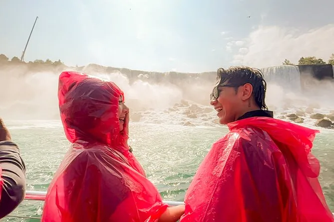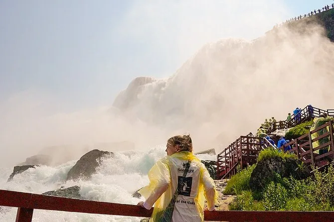 Después llegó Journey Behind the Falls. Te dan unos ponchos amarillos (el mío no me quedó bien) y bajas por túneles tallados en la roca. El agua retumba justo más allá de esas pequeñas ventanas — es tan fuerte que por un momento no escuchas ni tus propios pensamientos. Toqué la pared, fría y resbaladiza, casi vibrando. Raj nos contó historias de valientes que se lanzaron en barriles (yo no aguantaría ni cinco segundos). Luego caminamos hasta el embarcadero para subir al barco — Niagara City Cruises se acerca tanto que apenas puedes ver a través de las gafas por el spray. Todos sonreían como niños en ese momento.