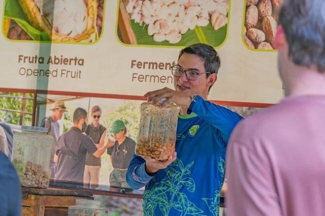 Probarás cerezas de café frescas, pulpa de cacao, chocolate preparado, jugo de caña de azúcar y café recién hecho.