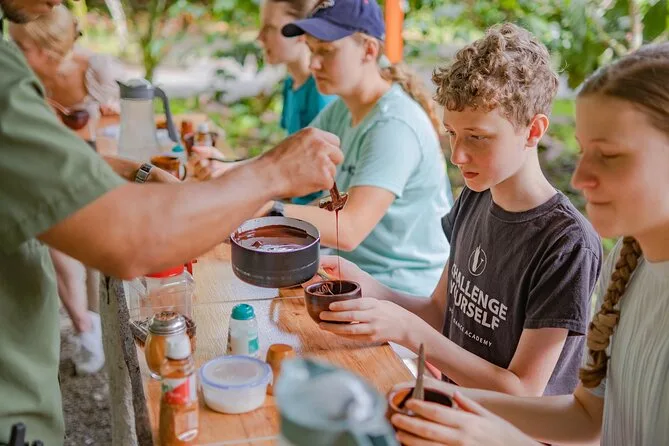 La parte de hacer chocolate se puso divertida y desordenada rápido — mis manos olían a manteca de cacao caliente por horas. Andrés también nos mostró cómo muelen la caña de azúcar; me dejó probar la antigua prensa de madera, que es más dura de lo que parece (casi me rindo a mitad). Li se rió cuando intenté decir “trapiche” en español — seguro lo dije fatal. Terminamos con tazas pequeñas de café recién hecho bajo un techo de zinc mientras la lluvia empezaba a caer, lo que hizo que todo supiera aún más rico.