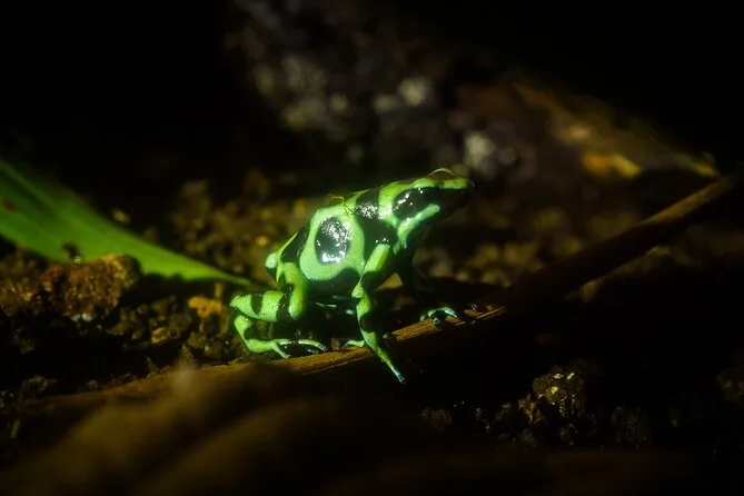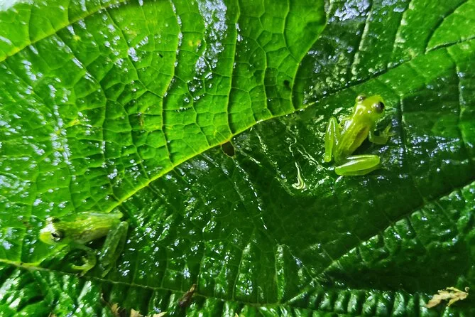 Almorzamos en un lugar pequeño cerca del parque—arroz, frijoles, plátanos y un guiso de pollo que sabía mejor que cualquier comida casera. Luego fuimos a un santuario familiar de perezosos escondido entre platanales y camiones viejos con las llantas ponchadas. La hija del dueño nos mostró dónde dormían dos perezosos bien arriba (me costó un buen rato encontrarlos). Se rió cuando intenté decir “oso perezoso” bien—esa palabra se siente lenta al decirla. Vimos ranas diminutas escondidas bajo las hojas y escuchamos el zumbido de las cigarras tan fuerte que parecía que estuvieran dentro de mi cabeza.