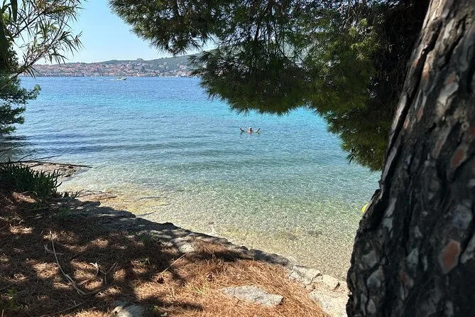 La primera parada fue una bahía tranquila en la isla de Ugljan. Algunos se lanzaron al agua de inmediato — yo dudé porque, siendo sincero, el agua fría no es lo mío. Pero metí los pies y no estaba nada mal; salada y fresca a la vez. Se olía un leve aroma a pino desde la ladera. Una pareja alemana se quedó en la lancha tomando el sol bajo la sombra, charlando mientras sonaba música suave de fondo. Marko señaló pequeños peces que se movían bajo nuestros pies cuando finalmente nos metimos con los snorkels (el equipo está incluido, así que no hace falta traer nada).