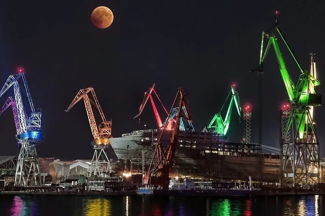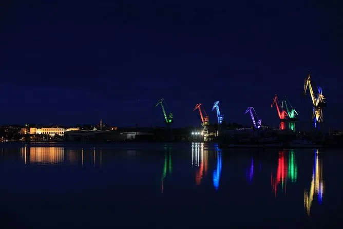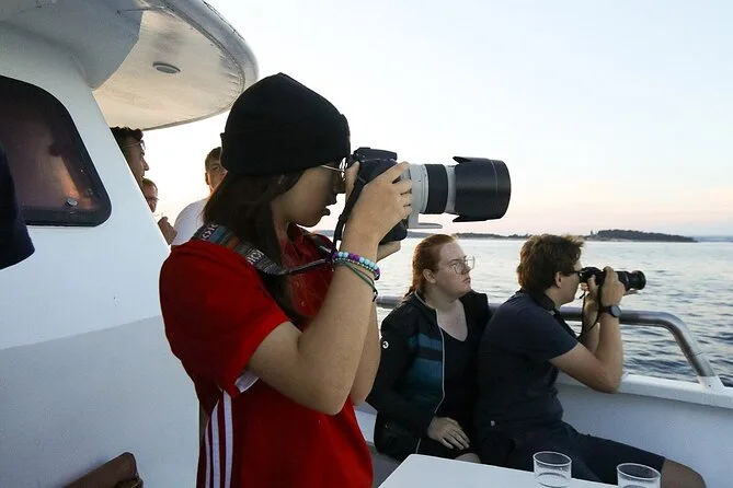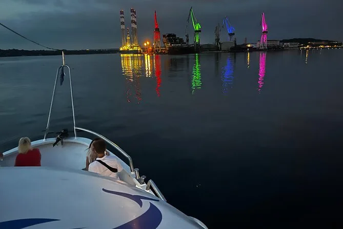 De regreso hacia Pula, todos nos amontonamos en un lado del barco para atrapar el último rayo de sol sobre Veliki Brijun. Las luces de la ciudad empezaron a parpadear frente a nosotros — esas grandes grúas iluminadas parecían sacadas de una película de ciencia ficción. Atracamos ya de noche, un poco salados y despeinados por el viento, pero sonriendo igual. Si buscas un tour de avistamiento de delfines en Pula que sea relajado pero especial (y con cena y bebidas incluidas), este es sin duda el indicado.