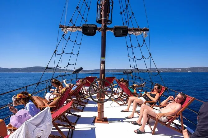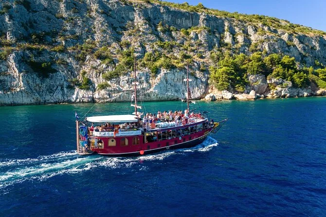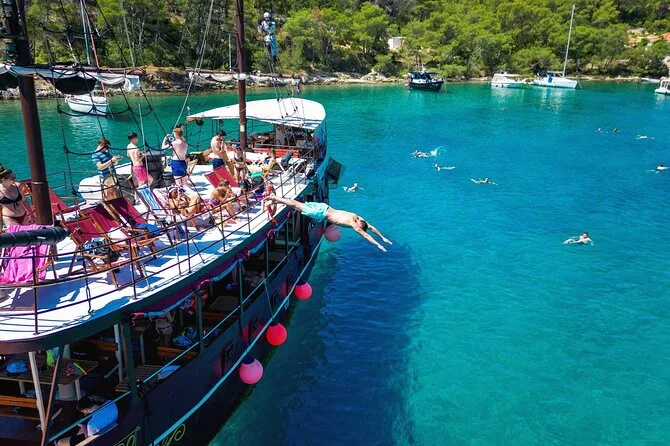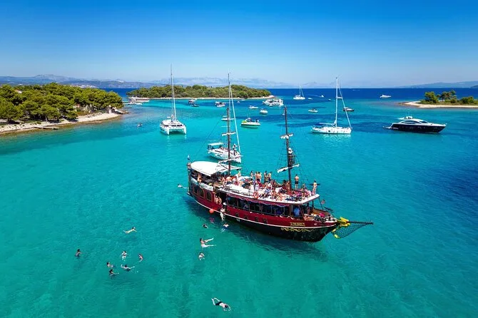 Tu día incluye crucero ida y vuelta desde Split en un barco pirata animado; entradas al único museo submarino de Croacia; uso de equipo de snorkel (con depósito reembolsable); vino nacional ilimitado, jugos y agua; almuerzo con tres opciones de hamburguesa, incluida vegetariana; baños a bordo; DJ en vivo; y mucho tiempo para nadar o relajarte antes de regresar por la tarde.