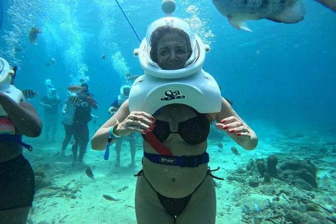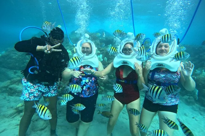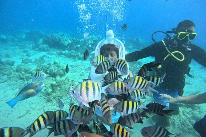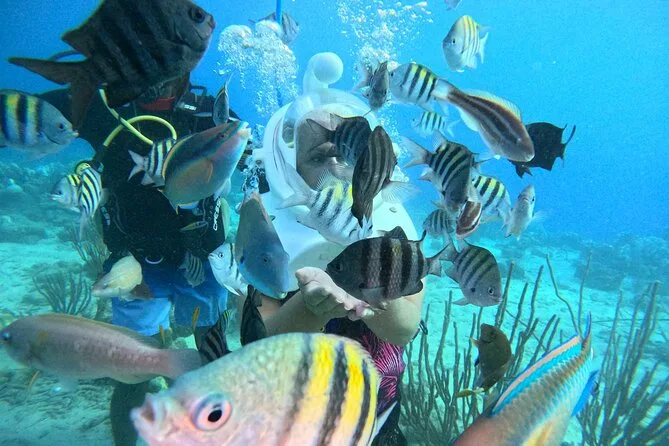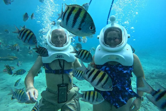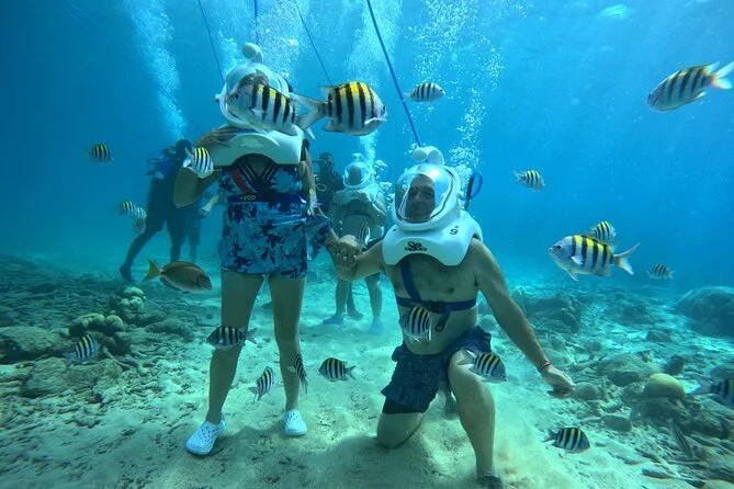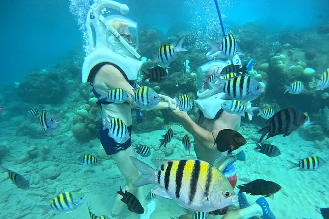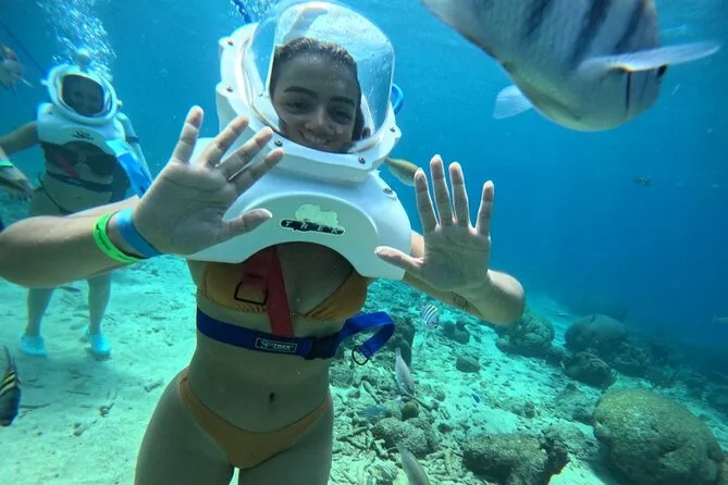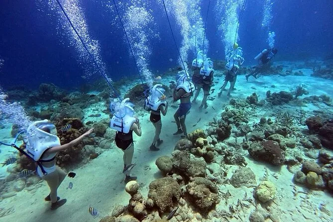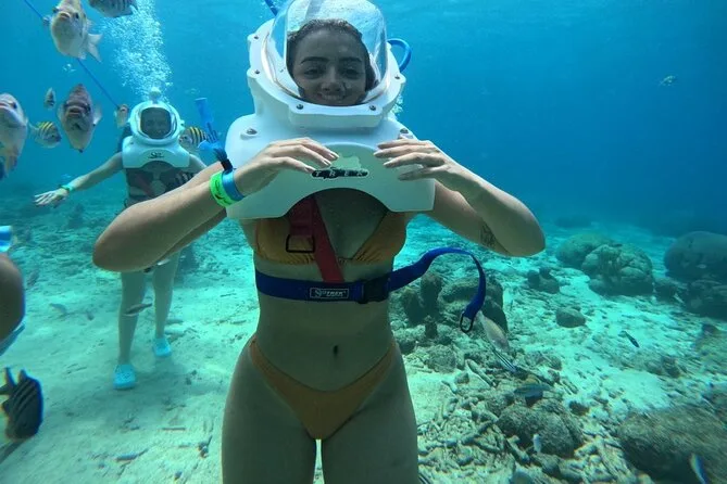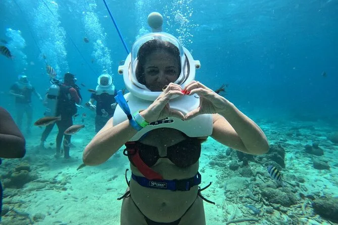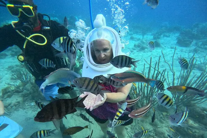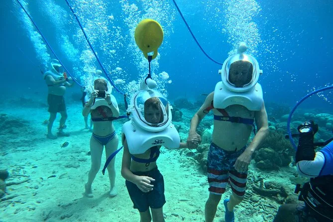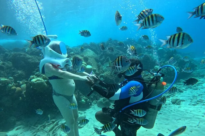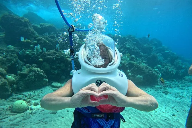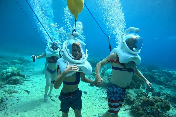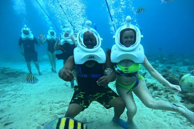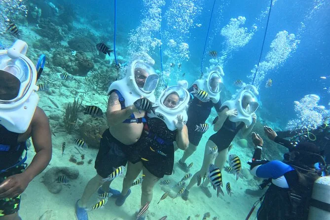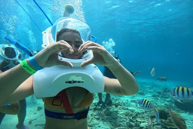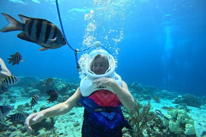 Desde la playa de Curazao entrarás a otro mundo—sin necesidad de nadar—para caminar por el fondo del mar rodeado de peces tropicales. Tu rostro se mantiene seco dentro del casco mientras un guía local hace que todo sea divertido y seguro. Prepárate para risas bajo el agua, sorpresas como peces curiosos que te rozan, y momentos que recordarás cada vez que sientas la brisa salada del mar.