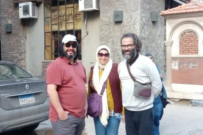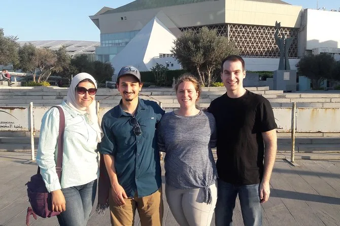 No esperaba que las Catacumbas de Kom el Shoqafa fueran tan frescas y húmedas — bajas por unas escaleras de piedra y de repente todo queda en silencio, solo se escuchan tus pasos resonando en las paredes. Hay algo extraño en ver tallas tan antiguas tan de cerca, como si el tiempo se doblara. Hossam nos señaló unos grafitis de hace siglos (los llamó “el Instagram antiguo”, lo que nos sacó una sonrisa). Después seguimos entre palmeras y bloques de apartamentos hasta llegar a la famosa biblioteca — desde fuera es enorme, toda curvas de cristal y luz reflejándose por todos lados. Adentro, la gente realmente lee libros de verdad. Eso me gustó.