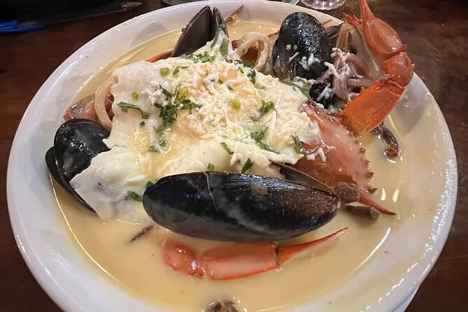 Disfrutarás mariscos frescos como camarones, pulpo, pescado relleno de camarón y sopa de mariscos.