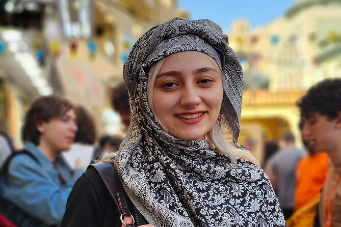 La Gran Mezquita Sheikh Zayed es… la verdad, no sé ni cómo describirla. Entras y todo se vuelve silencio—mármol bajo los pies, ese ligero aroma a oud flotando en el aire. Tariq nos contó que cada cúpula tiene su propia historia de diseño (perdí la cuenta, había como 20 cúpulas). Los detalles en oro parecían brillar con la luz de la mañana. En un momento, una niña se rió mientras intentaba caminar descalza sobre la alfombra—es lo más suave que he sentido bajo mis pies. Tuvimos tiempo de sobra para pasear; sin prisas.
