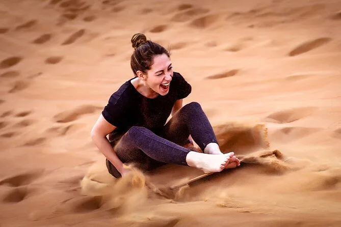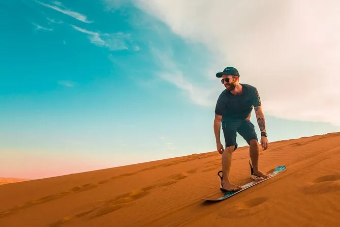 Te levantarás temprano para vivir de verdad el desierto de Abu Dhabi: dune bashing con un conductor local, deslizarte en sandboard (¡o caer!), conocer camellos tranquilos y luego volver a tu hotel. Prepárate para risas, nuevas sensaciones bajo tus pies y momentos de calma inesperados tan cerca de la ciudad.