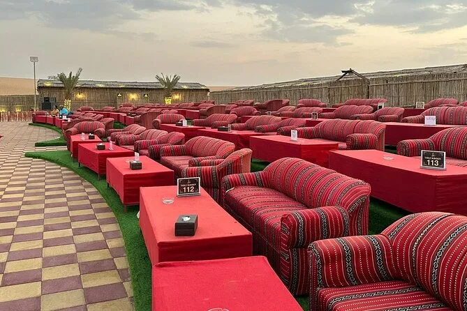 Tu experiencia incluye recogida privada en 4x4 desde el hotel directo al corazón de las dunas de Dubái para media hora de dune bashing antes de probar sandboard al atardecer y hacer fotos. En el campamento te reciben con té y café árabe junto a dátiles; puedes montar en camello por la arena y hacerte un dibujo de henna en la mano si quieres. Durante la noche hay bebidas ilimitadas y snacks antes de una gran cena buffet BBQ con opciones vegetarianas y no vegetarianas, además de entretenimiento en vivo como danza del vientre, giros de tanoura y un show de fuego antes de regresar al hotel.