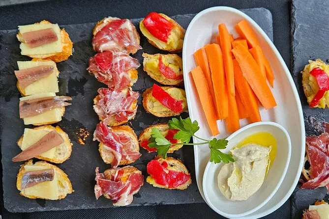 Cada persona recibe tres tapas españolas: jamón ibérico, tortilla española, manchego con anchoas, además de hummus con palitos de pan.