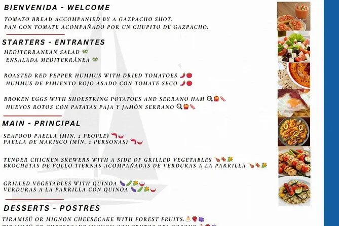 Tu tarde incluye 2-3 bebidas (cerveza, vino, cava o sangría), snacks de jamón y queso español, además de hummus con verduras. Un patrón profesional guía tu grupo pequeño por la costa de Barcelona al atardecer; hay equipo de paddle surf para los más aventureros. Puedes mejorar tu experiencia con una cena de tres platos preparada por un chef a bordo antes de regresar al puerto bajo las luces de la ciudad.