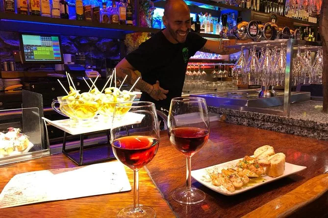 Tu noche incluye un recorrido guiado por cinco de los mejores bares de pintxos de Bilbao con un experto local. Disfrutarás de 1–2 pintxos recién hechos en cada parada más cinco bebidas (vino, sidra, cerveza o agua), formando una cena completa antes de volver a la noche de la ciudad.