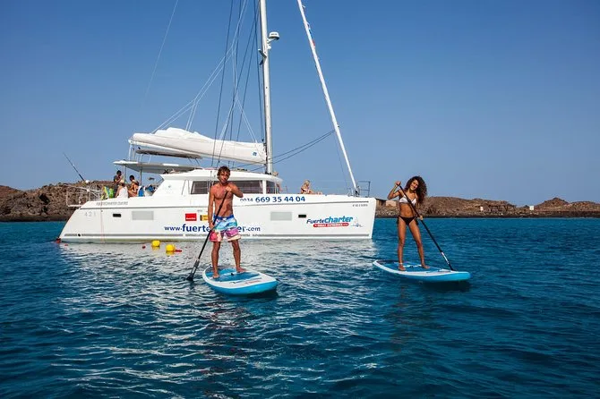 Tu día incluye recogida en hotel o puerto en Corralejo, paseo guiado en catamarán con paradas para kayak, paddle surf (SUP), equipo de snorkel gratis, paella fresca de mariscos a bordo con bebidas ilimitadas (cerveza, vino, refrescos), además de fotos descargables de tu aventura antes de regresar cómodamente tras cuatro horas de experiencia.