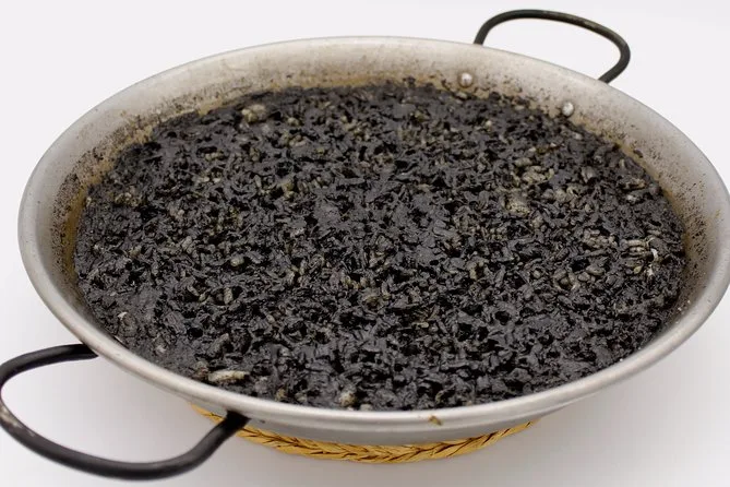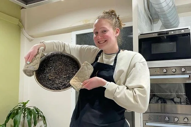 Lola nos empezó con la ensaladilla rusa y las croquetas de jamón. Nos enseñó a darles forma, riéndose cuando mi primera croqueta parecía una patata llena de bultos. “No pasa nada,” me dijo, y eso me relajó al instante. Hablamos de dónde venía cada uno (dos australianos, una pareja americana) y luego nos manchamos las manos preparando la paella de arroz negro. La tinta de calamar lo volvió todo oscuro — hasta mis dedos — pero olía increíble mientras burbujeaba en la sartén. Lola no paraba de servir vino y contar historias sobre las recetas de su abuela; intenté decir “ajoarriero” en voz alta y casi se atraganta de la risa con su cerveza.
