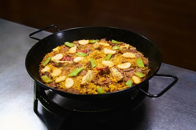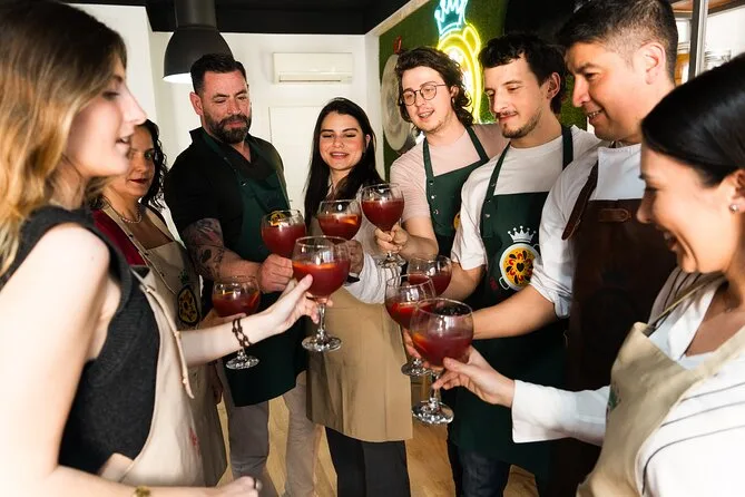 Tu tarde incluye clases prácticas para preparar sangría con más de diez ingredientes, aperitivos como aceitunas con anchoa y tortilla española, bruschetta con jamón de Salamanca y tomate, paella de marisco o pollo al fuego (o vegana si prefieres), agua embotellada durante toda la sesión y degustación de tres licores españoles antes de volver a explorar Madrid.