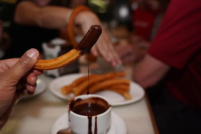 Tu noche incluye todas las degustaciones—como queso manchego en el Mercado de San Miguel, tortilla de patata clásica, gambas con vino de la casa, croquetas de taberna histórica, bocadillo de calamares con cerveza—y termina con un postre local cerca de Puerta del Sol. Un guía local experto te acompaña en todo momento; solo trae calzado cómodo y ganas de descubrir el Madrid nocturno.