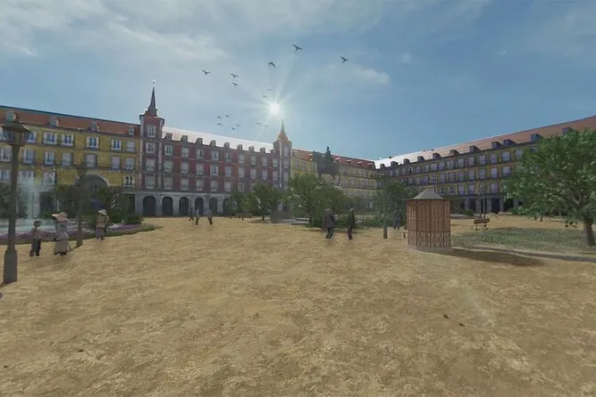 Seguimos caminando hacia la Plaza Mayor, mientras Carmen nos contaba historias de duelos y fiestas reales sin parar. Señaló unas pintadas del siglo XVII en una pared (yo ni las habría visto). La parte de VR aquí fue increíble: la plaza se llenó de comerciantes y músicos, y por un momento olvidé en qué siglo estaba. Alguien cerca recibió una llamada y me sacó de ese viaje en el tiempo; supongo que tiene sus límites. Aun así, ver la Plaza de la Villa como un laberinto medieval en las gafas fue muy emocionante. Hay algo especial en ver la Casa de la Villa tal como fue en otro tiempo.
