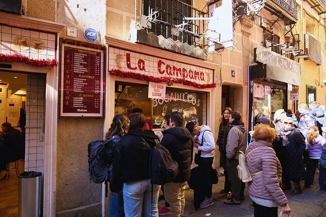 La caminata por el casco antiguo y el Barrio de las Letras fue más como seguir a un amigo que a un grupo. Luis saludaba a casi todo el mundo en cada esquina — una señora desde la ventana de su panadería nos regaló unos pastelitos diminutos. En La Campana, evitamos la cola (menos mal) y mordimos esos bocadillos de calamares fritos que estaban tan calientes que podías quemarte la lengua si no tenías cuidado. Dedos pringosos, pan suave, crujiente — sencillo pero perfecto después de tanto andar. No paraba de pensar en cómo los locales se los comen de pie en la calle, charlando de fútbol o política como si fuera lo más normal del mundo.