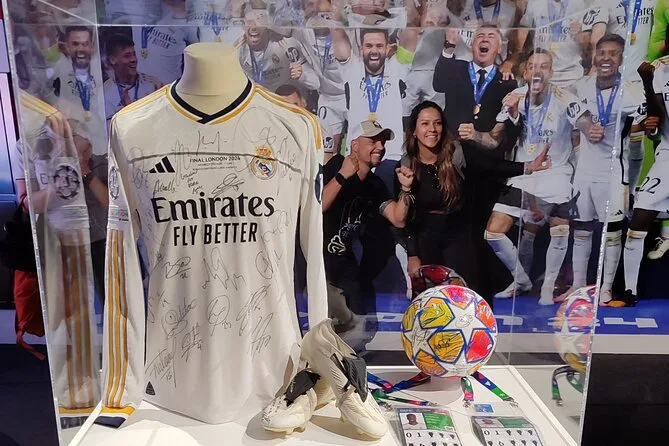 Tu día incluye entradas al Santiago Bernabéu y su museo, un guía local en español o inglés (con opción de grupo reducido para megafans), auriculares para no perder detalle, acceso a zonas VIP abiertas y pantallas interactivas — todo desde la entrada del estadio, sin recogida en hotel.