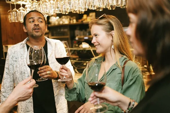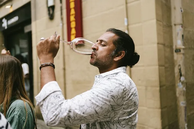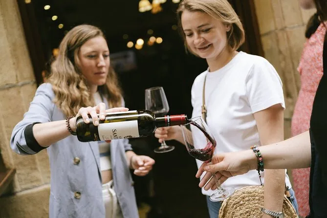 Tu noche incluye visitas guiadas a varios bares icónicos de pintxos en la Parte Vieja, todas las degustaciones de comida (suficientes para cenar), cinco copas de vino local o bebidas, impuestos y tasas incluidos, además de historias y consejos de tu guía culinario local experto, terminando en el centro de San Sebastián.