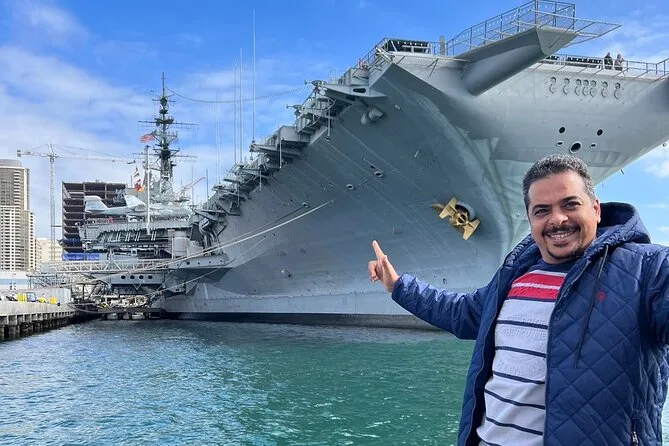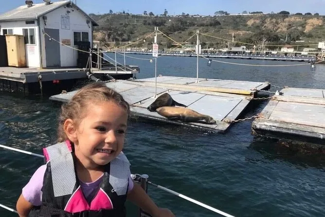 Verás el skyline del centro de San Diego, barcos históricos como el Midway, leones marinos cerca de las boyas y posiblemente el atardecer sobre Point Loma.