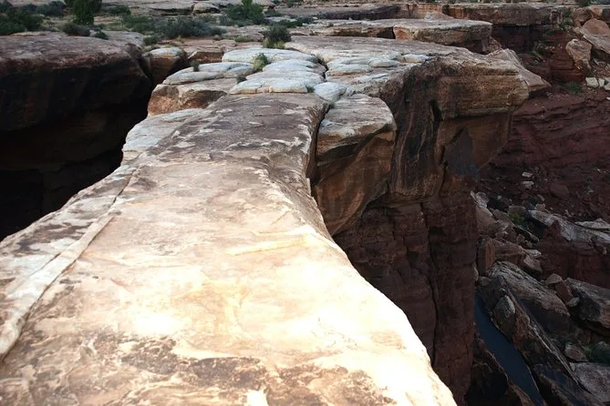 La verdadera emoción llegó al tomar la White Rim Road. El 4x4 saltaba sobre las rocas y el mundo se desplomaba a un lado: mil pies de caída directa a nada más que espacio y río. No dejaba de pensar en lo antiguo que se sentía todo aquí. En Musselman Arch bajamos para una corta caminata; pasé la mano por la arenisca (es más rugosa de lo que parece) y alguien bromeó con saltar al otro lado—por suerte nadie lo hizo. Se olía la salvia y ese calor seco que, en vez de cansar, te despierta.