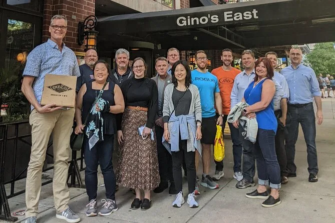 Lo primero que me llamó la atención fue el aroma: queso y salsa de tomate que se escapaba a la acera justo cuando nos encontramos con nuestra guía frente a la pizzería. Eran poco más de las 11, el cielo estaba nublado pero no hacía frío, y ya había gente haciendo fila para su almuerzo. Nuestra guía (creo que se llamaba Jamie) nos entregó porciones de deep-dish tan grandes que necesitabas las dos manos para sostenerlas. Nos contó que esta pizza no es algo que se pida al paso, sino una comida que planificas con calma. Intenté no quemarme la lengua y no lo logré, lo que hizo reír a Jamie. La verdad, valió la pena.