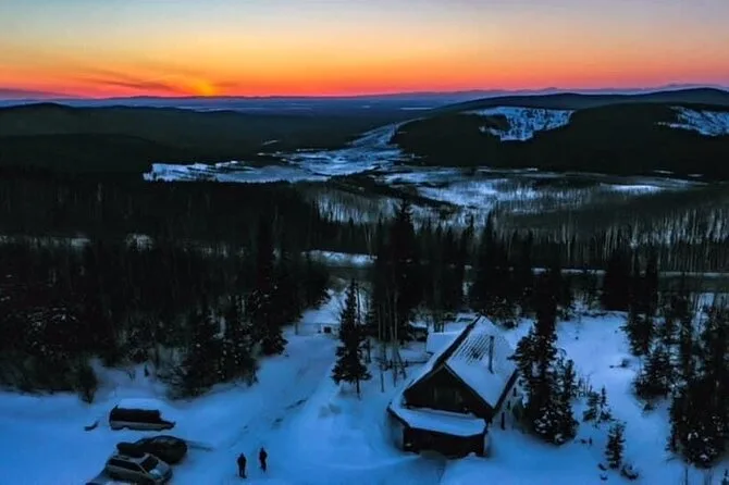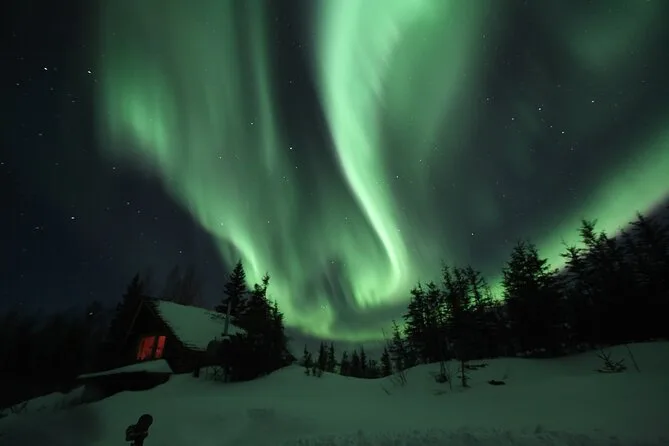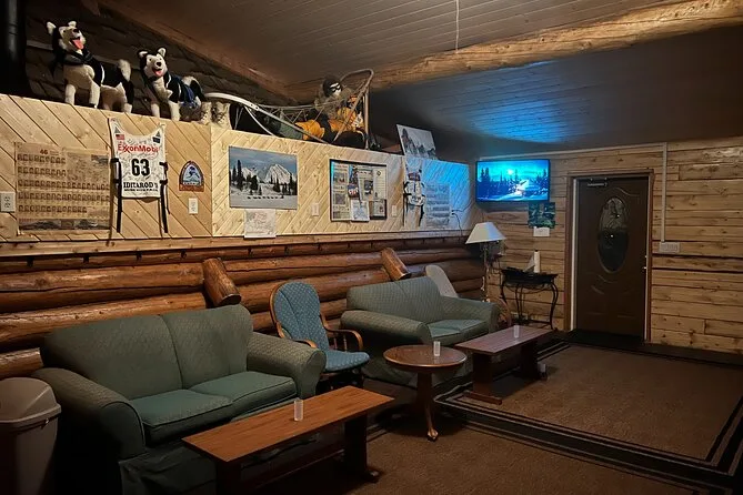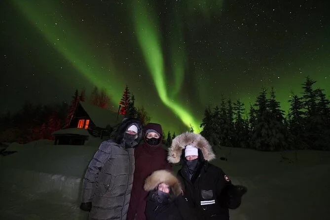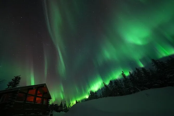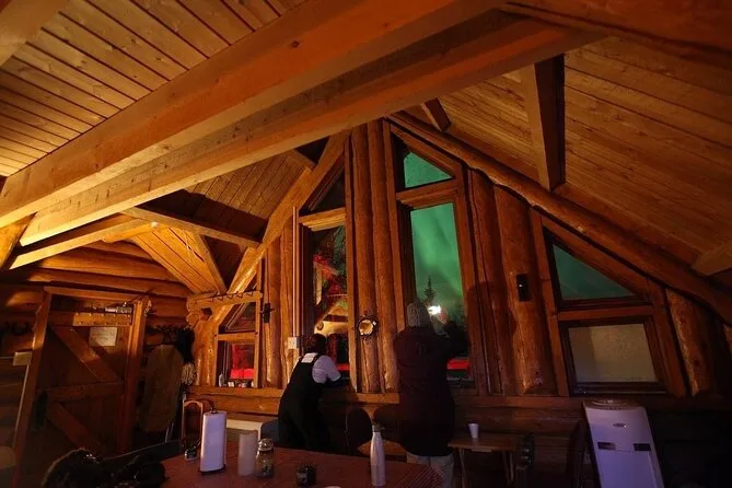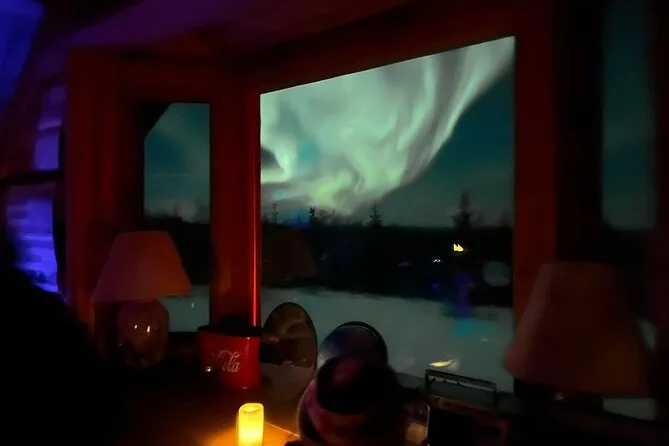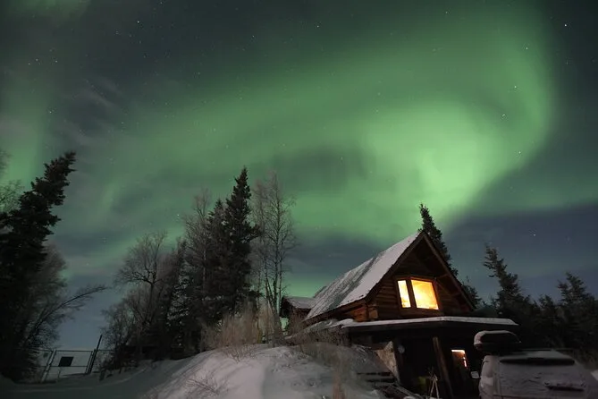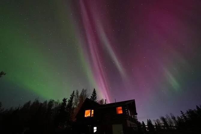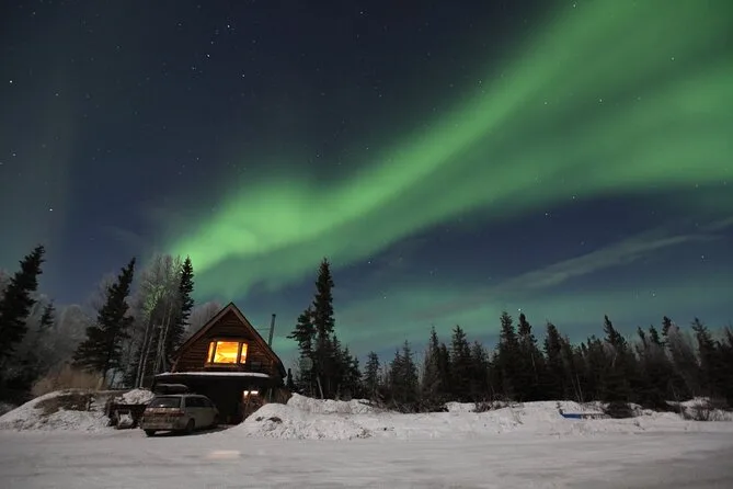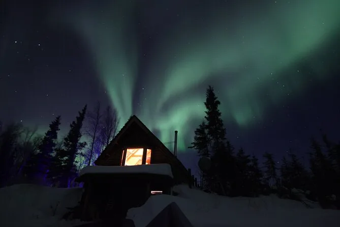 Tu noche incluye recogida en hoteles céntricos de Fairbanks (no Airbnbs), transporte hasta Aurora Husky Lodge en una colina sobre la ciudad, bebidas calientes y snacks ilimitados en una cabaña rústica y acogedora, además de mucho tiempo para ver auroras antes de regresar después de las 2am.