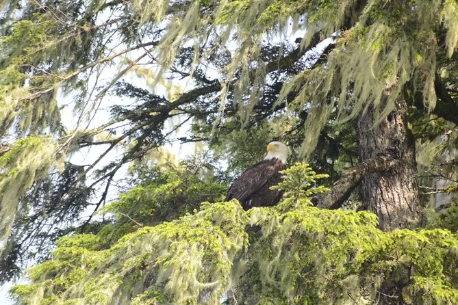 No esperaba ver tantas focas comunes descansando en las rocas cerca de Walden Rocks. Parecían casi de mentira hasta que una levantó la cabeza y nos miró fijamente. Nos detuvimos un rato para observarlas mientras Sarah contaba una historia sobre cómo esas rocas recibieron su nombre; la verdad es que me perdí parte porque estaba tratando de sacar una foto sin que se me cayera el móvil al agua (casi lo logro). Luego llegamos a la isla Metlakatla, donde hicimos una pausa para alimentar a las águilas; ver a esas aves lanzarse por el pescado justo al lado del barco fue impresionante, como si fueran las dueñas del lugar.