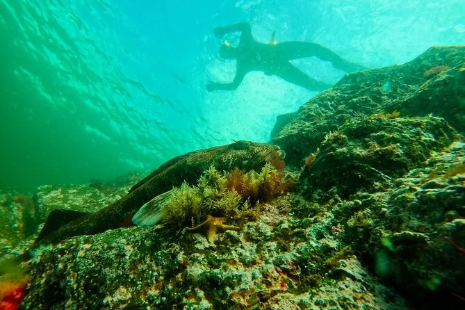 Meterse al agua no fue nada elegante (me resbalé una vez y Jamie solo sonrió), pero en cuanto metí la cara bajo el agua todo cambió. Solo se escuchaban mis burbujas. La vida marina aquí no tiene nada que ver con los arrecifes tropicales: había estrellas de mar moradas aferradas a las rocas y destellos de anémonas naranjas que parecían casi eléctricas contra la piedra. El frío se colaba al principio por el traje, pero luego desapareció; lo que más recuerdo es la extraña sensación de flotar y ver pececillos moverse rápido alrededor de mi máscara. En un momento apareció una foca común cerca, solo su cabeza con ojos muy abiertos, y luego desapareció. Intenté saludar, pero quién sabe si me vio.