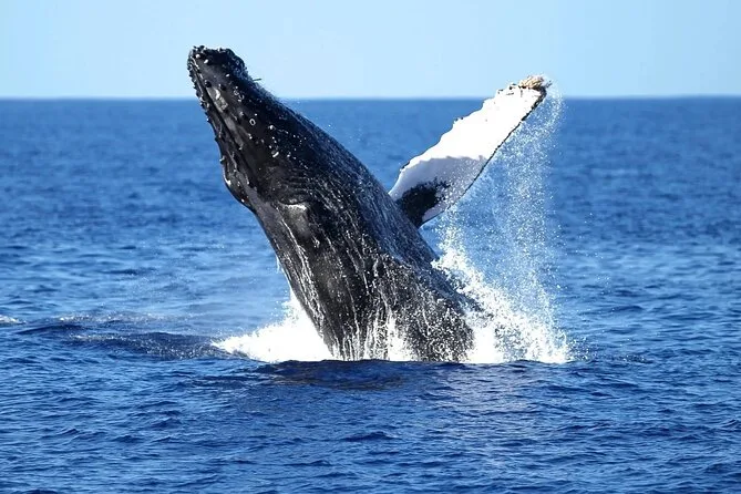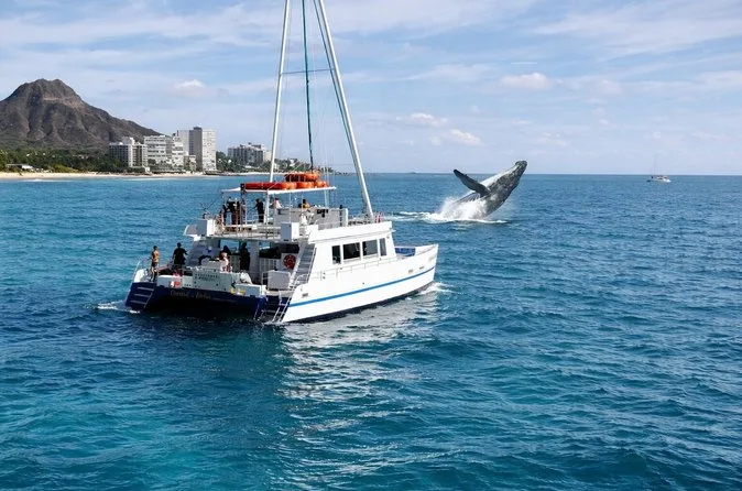 Tu día incluye un tour guiado de avistamiento de ballenas desde Waikiki con acceso a cubiertas abiertas y una sala de observación submarina para ver bajo las olas; snacks y bebidas ligeras gratis a bordo; niños menores de 4 años viajan gratis; y si no ves ballenas en tu primera salida, te reprograman sin costo dentro de cinco días.