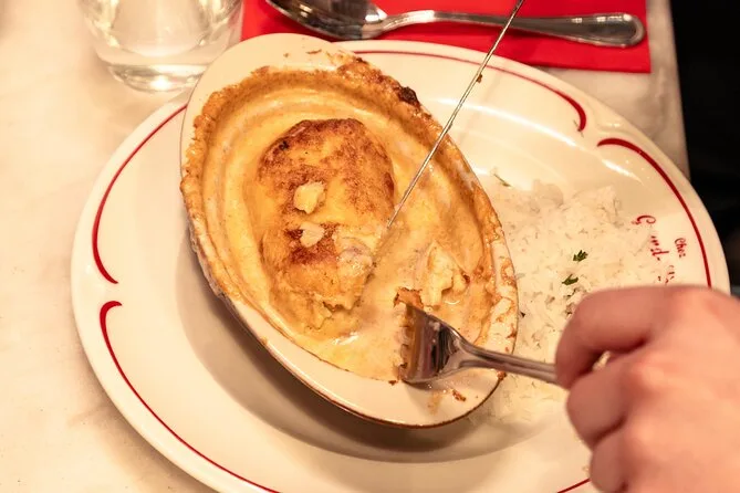 La comida fue en un auténtico bouchon: mesas de madera, manteles de papel y un camarero que parecía haber escuchado todas las preguntas de turistas del mundo. La quenelle llegó humeante con una salsa cremosa — la verdad, esperaba algo más pesado pero resultó ligera, casi esponjosa. Camille nos explicó que cada familia tiene su receta; la suya lleva lucio pero “nunca demasiada nuez moscada.” Alguien intentó pedir en francés y fue corregido con una sonrisa y un guiño, lo que nos hizo reír a todos.