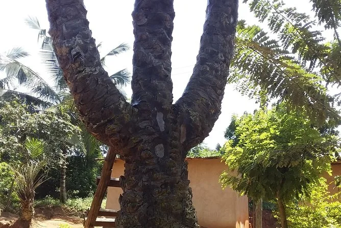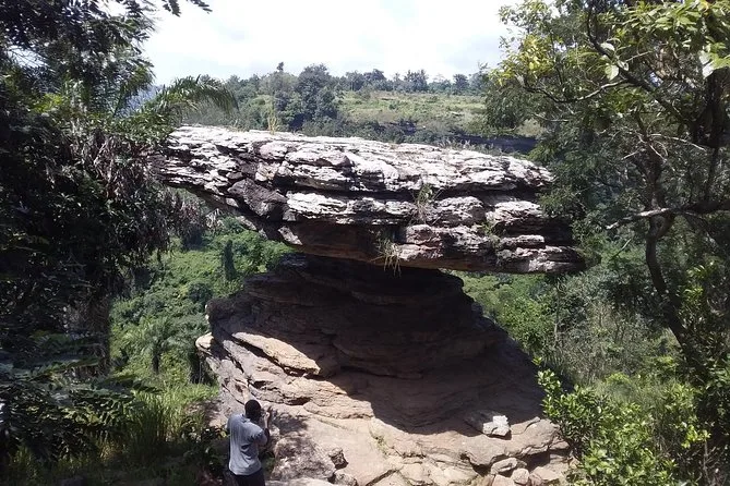 Después de los jardines, nos dirigimos hacia las Cataratas Boti. El camino se volvió accidentado y el polvo rojo se levantaba detrás de nuestra furgoneta, típico de las carreteras de la Región Oriental. En el borde del bosque, nuestro guía local nos llevó en una corta caminata entre la densa vegetación. Se escuchan pájaros por todas partes y a veces se percibe un aroma a jengibre silvestre. La subida a Umbrella Rock no es muy difícil, pero conviene llevar calzado cómodo; una vez allí, tienes una vista curiosa donde la roca realmente parece un paraguas equilibrado sobre los árboles. Hicimos una breve parada en un pueblo cercano para ver la palmera de tres cabezas, que según los locales trae buena suerte.