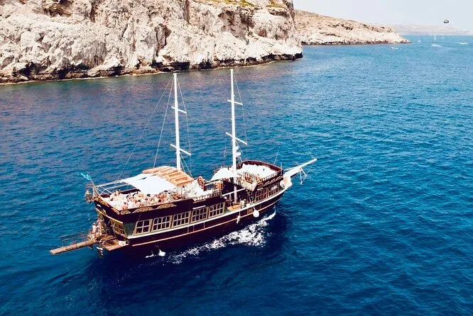 Tu noche incluye recogida en el puerto de Mandraki en Rodas, cerveza, vino, Aperol Spritz o refrescos ilimitados durante todo el crucero, una cena BBQ griega recién preparada servida durante la parada para nadar en las Termas de Kallithea, uso de baños a bordo y accesibilidad total para sillas de ruedas o cochecitos antes de regresar al puerto al atardecer.