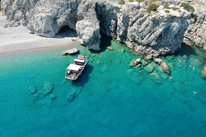 Tu entrada incluye el uso del equipo de snorkel para las paradas en las cuevas de Traganou y la bahía Anthony Quinn, acceso a un barco con aire acondicionado y baños, además de cervezas, refrescos y agua ilimitados durante todo el crucero — solo llega listo para nadar o relajarte con una bebida.