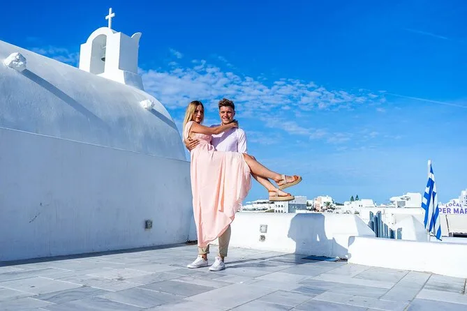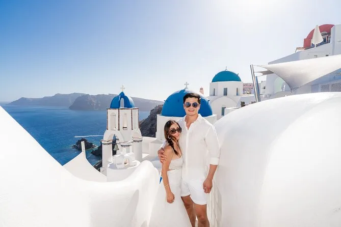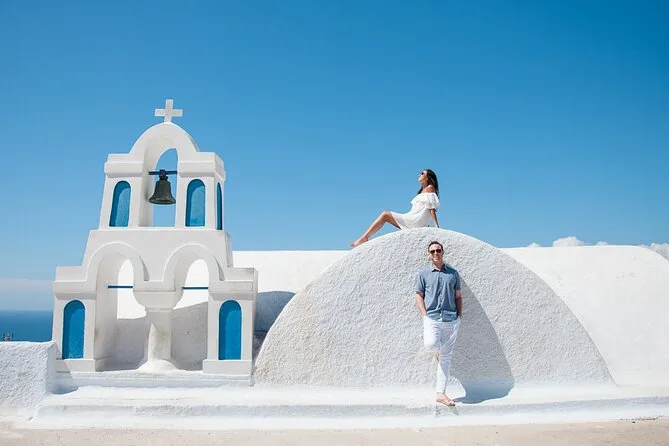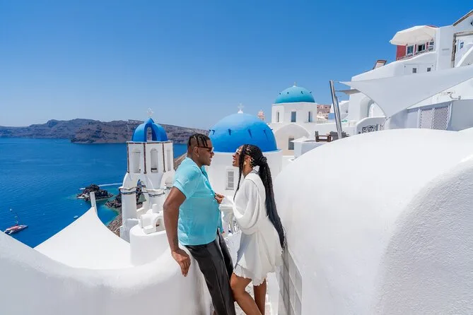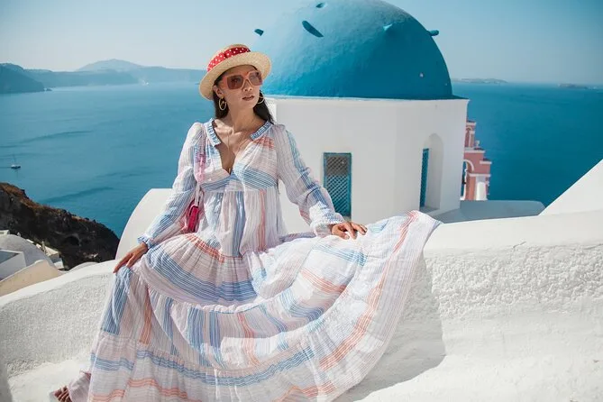 Tu experiencia incluye un fotógrafo local profesional que te guiará por los rincones más fotogénicos de Santorini en coche — como Oia o Imerovigli — y recibirás 40 fotos editadas en siete días. También puedes añadir servicios de peinado y maquillaje por un costo adicional.