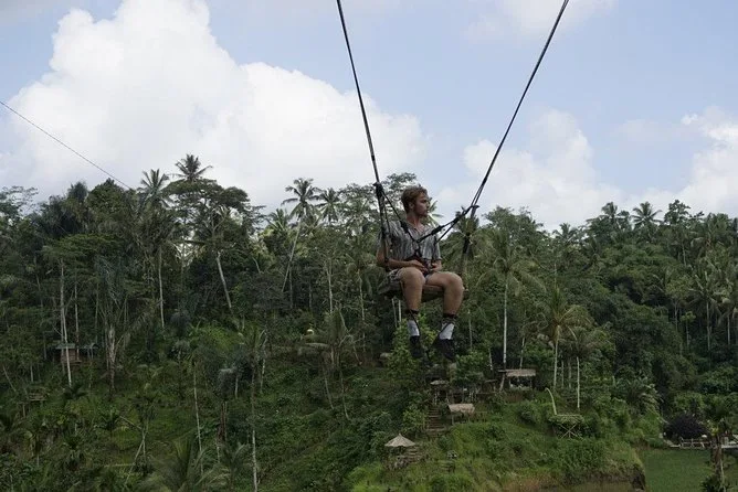Luego fuimos al famoso columpio sobre los arrozales de Tegallalang. Confieso que al principio dudé — los columpios parecen más aterradores de lo que son — pero una vez arriba, solo ves verde por todos lados. También hay zonas para fotos con nidos de pájaros si las alturas no son lo tuyo. Después, paseamos por los mismos campos de arroz; un par de agricultores nos saludaron y nos indicaron un puesto que vendía cocos jóvenes bien fríos en una nevera.