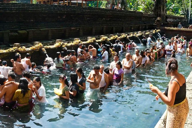 Más tarde, caminamos descalzos sobre las piedras del Templo Tirta Empul. El agua estaba fría—más de lo que esperaba—y había familias haciendo fila para el ritual de purificación. Nuestro guía explicó cómo los locales vienen aquí en busca de bendiciones, especialmente antes de grandes eventos en sus vidas. El sonido del manantial burbujeando tiene un efecto sorprendentemente relajante. Se percibe el aroma del incienso por todas partes.