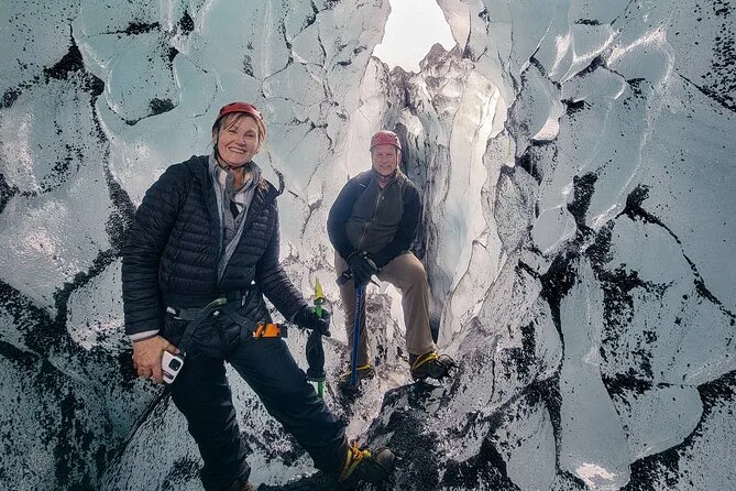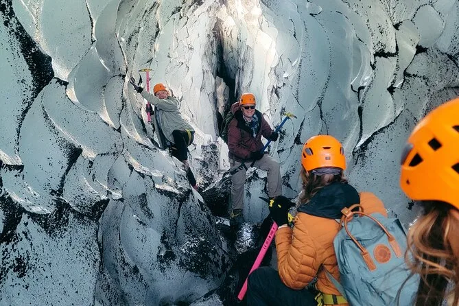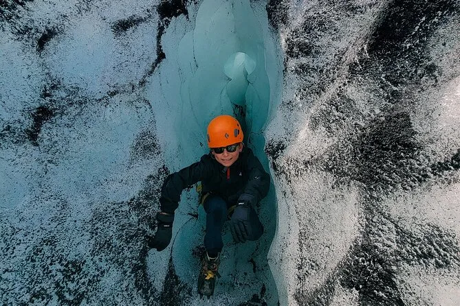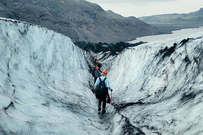 Tu día incluye encontrarte con un guía local certificado en el aparcamiento de Sólheimajökull, ponerte crampones, casco, arnés y piolet antes de adentrarte en el glaciar juntos — no necesitas traer más equipo aparte de tus botas y guantes.