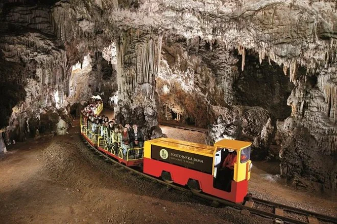 Viajarás en un tren subterráneo por los vastos túneles de la Cueva de Postojna, descubrirás salamandras proteo raras y luego te adentrarás en la historia en el castillo de Predjama, todo acompañado de relatos locales y con fácil acceso desde Sistiana.