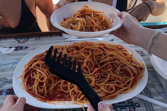 Anclando justo frente a Sorrento, nos entregaron máscaras de snorkel y flotadores inflables—nada lujoso pero perfecto para flotar. El agua estaba fresca pero no fría; podía ver peces plateados zigzagueando entre las rocas bajo la superficie. De vuelta a bordo, brindamos rápido—se descorchó un Prosecco entre risas—y luego llegó el almuerzo: ensalada caprese con mozzarella tan fresca que crujía al morderla, y tomates cultivados en la tierra de Sorrento.