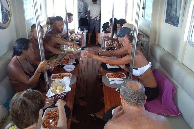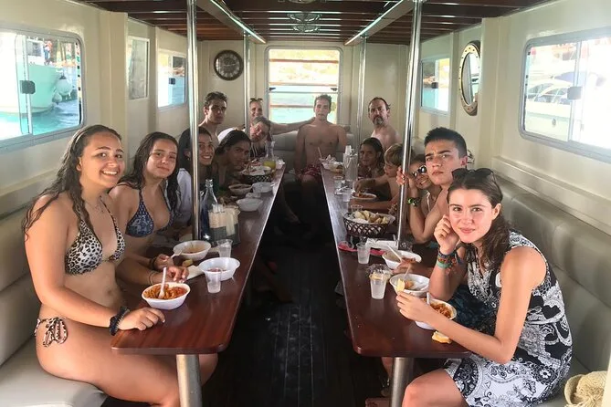 El barco cuenta con sistema de música MP3; los invitados suelen bailar o relajarse entre paradas.