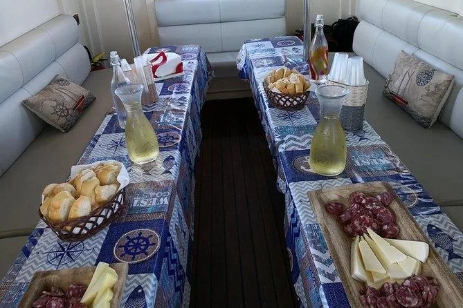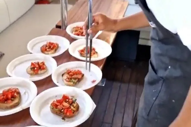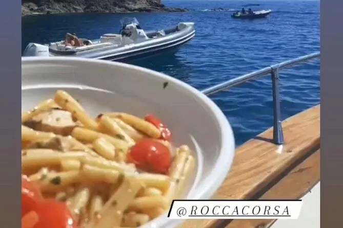 Tu día incluye encuentro en el puerto de Forio antes de subir a un espacioso yate motor con duchas y tumbonas; recibirás una bebida de bienvenida al llegar, seguida de agua y refrescos ilimitados (más vino), un aperitivo matutino, almuerzo de mariscos de dos platos con pan y café servido mientras navegas por los lugares más icónicos de Ischia—y luego un tentempié de jugos naturales y dulces caseros antes de volver al puerto.