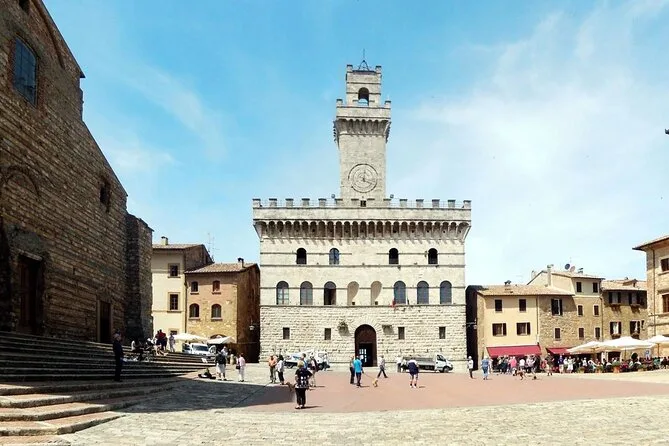 Tu día incluye un tour guiado por antiguas bodegas etruscas bajo el centro de Montepulciano, una cata de seis vinos locales DOC y DOCG (como Supertoscano y Vino Nobile), y bruschetta fresca con aceite de oliva virgen extra—todo accesible si aparcas en S. Donato o P8 y luego caminas.