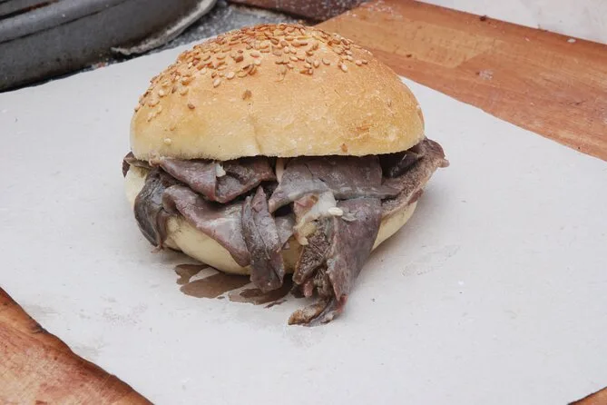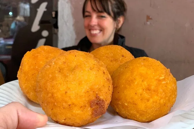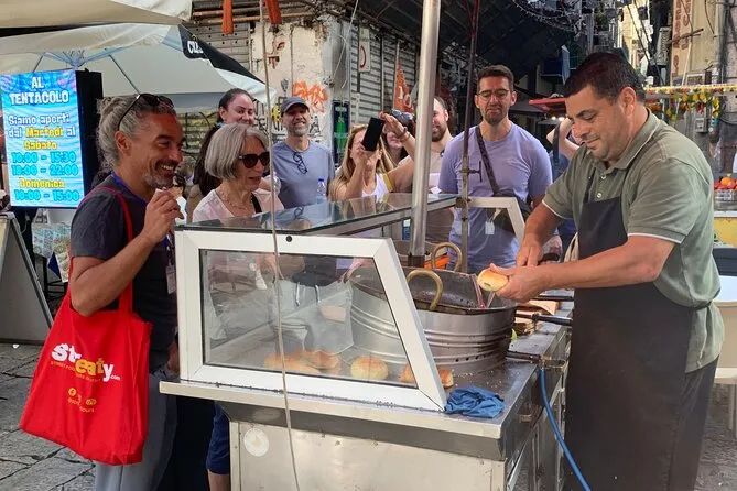 El tour incluye arancini (bolas de arroz rellenas), panelle (frituras de garbanzo), aceitunas sicilianas, "pani ca' meusa" (bocadillo de despojos de ternera), postre de temporada (cannoli o gelato) y bebidas como cerveza o vino.