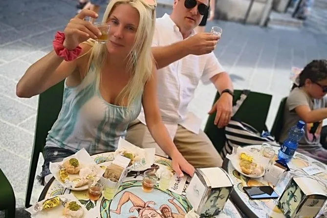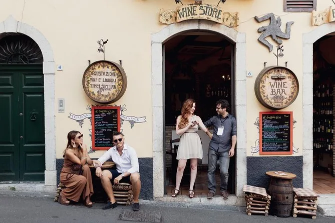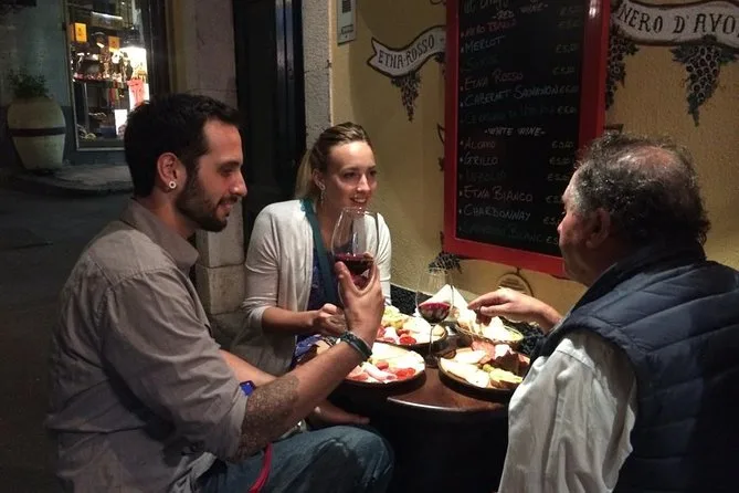 Tu noche incluye degustaciones guiadas en tres lugares auténticos: mariscos frescos con vinos blancos sicilianos (y Prosecco de bienvenida), comida de tierra acompañada de tintos regionales en un bar acogedor, y dulces tradicionales con licores locales en una pastelería clásica — todo dirigido por un guía experto en gastronomía desde Porta Messina en el casco antiguo de Taormina.