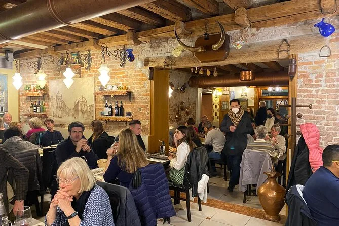 Tu día incluye paseos guiados por el Gueto Judío y el barrio de Cannaregio en Venecia, con varias paradas para degustar comida tradicional veneciana — pasta fresca, dulces, vino local y helado — todo acompañado por un guía local que comparte historias en cada calle.