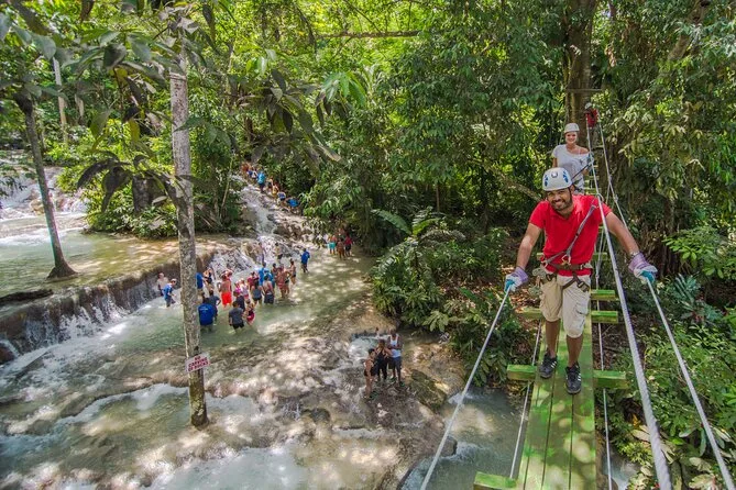 El tour incluye tres ziplines justo sobre Dunn's River Falls y un cruce por un puente al estilo Indiana Jones.